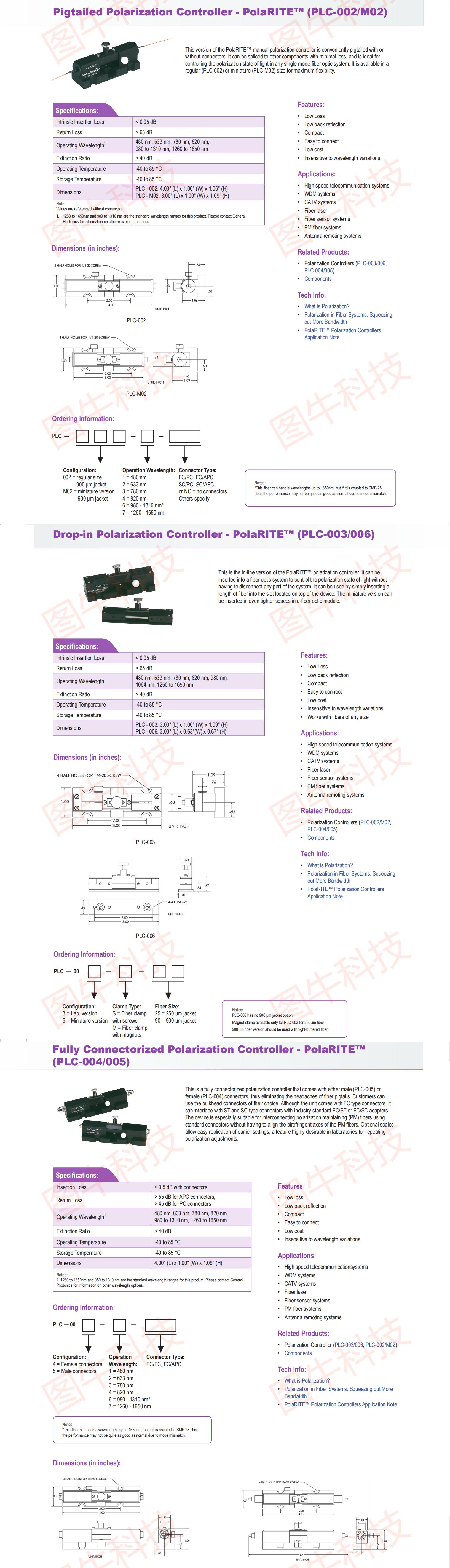 这是一个完全连接偏振控制器,带有公(PLC-005)或母(PLC-004)连接器,从而消除了令人头痛的光纤尾纤。客户可以使用自己选择的舱壁连接器。尽管该设备配备了FC型连接器,但它可以与带有行业标准FC/ST或FC/SC适配器的ST和SC型连接器连接。该装置特别适用于使用标准连接器互连保持偏振(PM)光纤,而无需校准PM光纤的双折射轴。允许容易地复制以前的设置,一个可取的特点是适合实验室重复偏振调整。