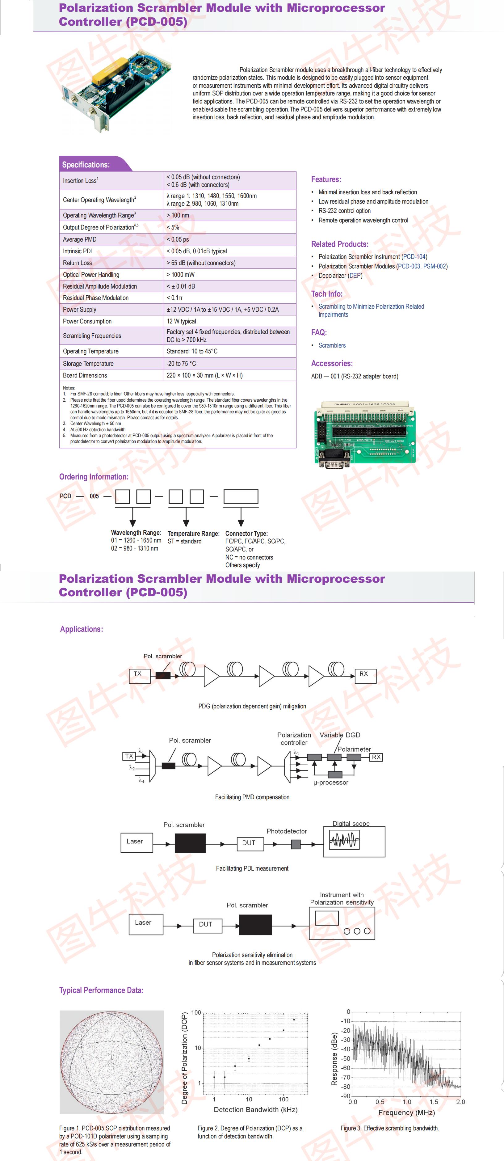 PCD-003/005偏振扰偏模块(Polarization Scrambler)结合了光纤挤压偏振控制器和专用驱动电子器件,在几毫秒内实现了Poincaré球体的均匀覆盖。由于它们利用了偏振控制器的共振频率,所以扰偏器的置乱速率是固定的。由于全光纤结构,它们具有低插入损耗和低背反射以及最小的相位和振幅调制。