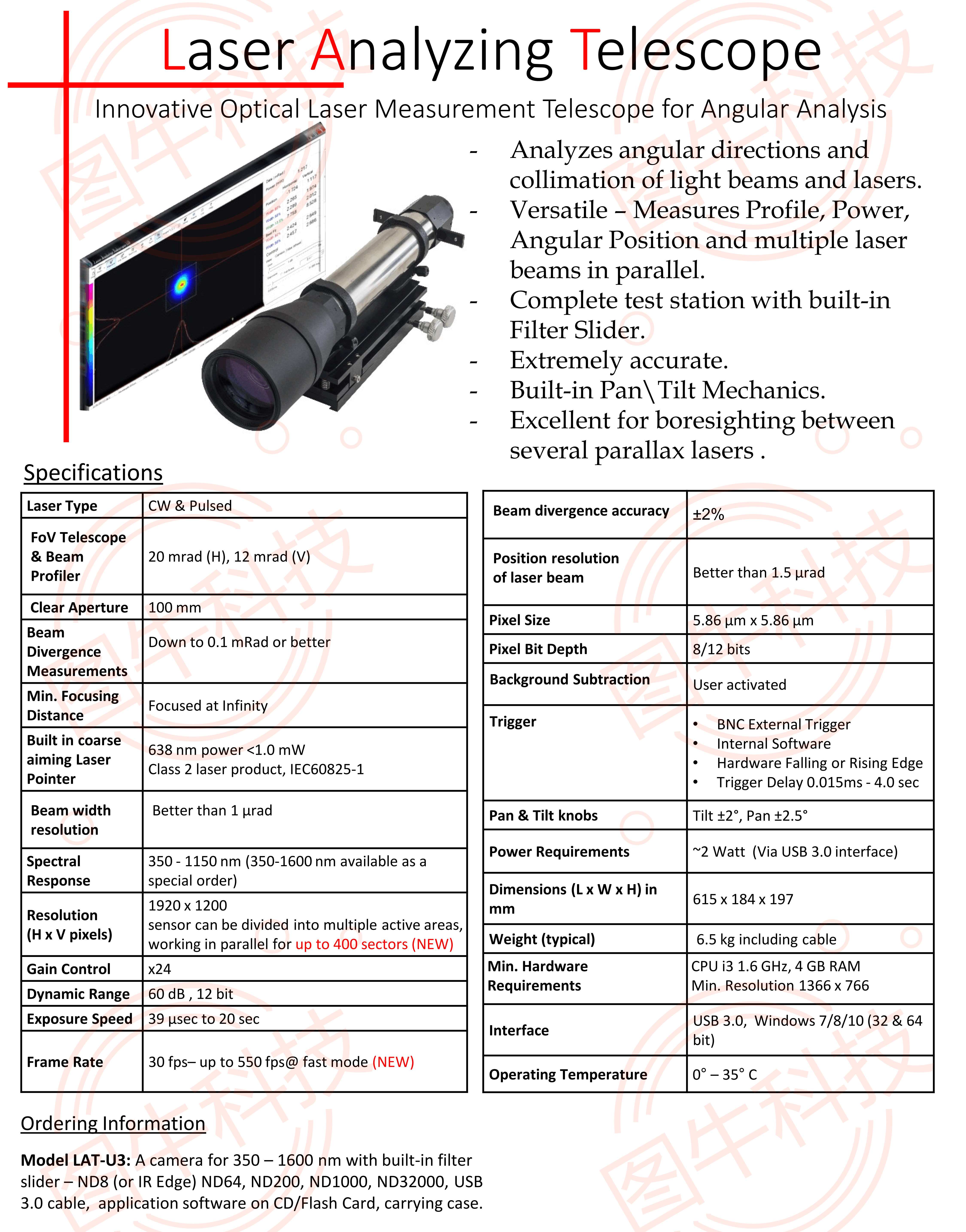 LAT(激光分析望远镜)是一种强大的测量仪器,可以直接测量激光束或其他光源。LAT将分析和显示入射激光束的角度方向,分辨率可达1微弧度,精度可达1mm(~20微弧度)。内置的背面滤波器滑块允许控制激光水平撞击探测器区域。此外,特殊的版本将允许交叉类准直目标进行角度测量。提供的软件可以清楚地显示结果。