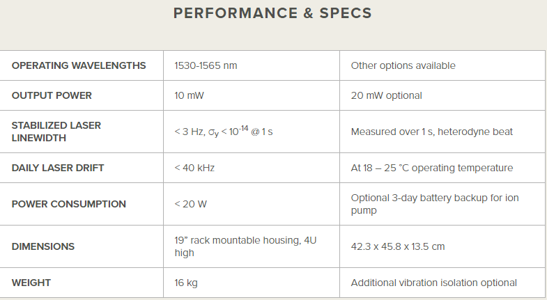 Stable Lasers公司提供的超窄线宽稳频激光器是高精度的实验需要超稳定的窄线宽激光光源。3Hz超窄线宽稳频激光器的稳定线宽可以达到3Hz,可以在一天之内完成安装和移动,且足够可靠,3Hz超窄线宽稳频激光器可以提供相同的性能年复一年。 Stable Lasers公司提供的超窄线宽稳频激光器,被设计成即插即用的,提供了1Hz线宽和稳定性,通过开箱即用的按钮自动锁定来控制。一个车载离子泵在运输和搬迁期间保持真空,以减少安装时间,而一个易于阅读的前面板提供控制和正在进行的系统诊断。