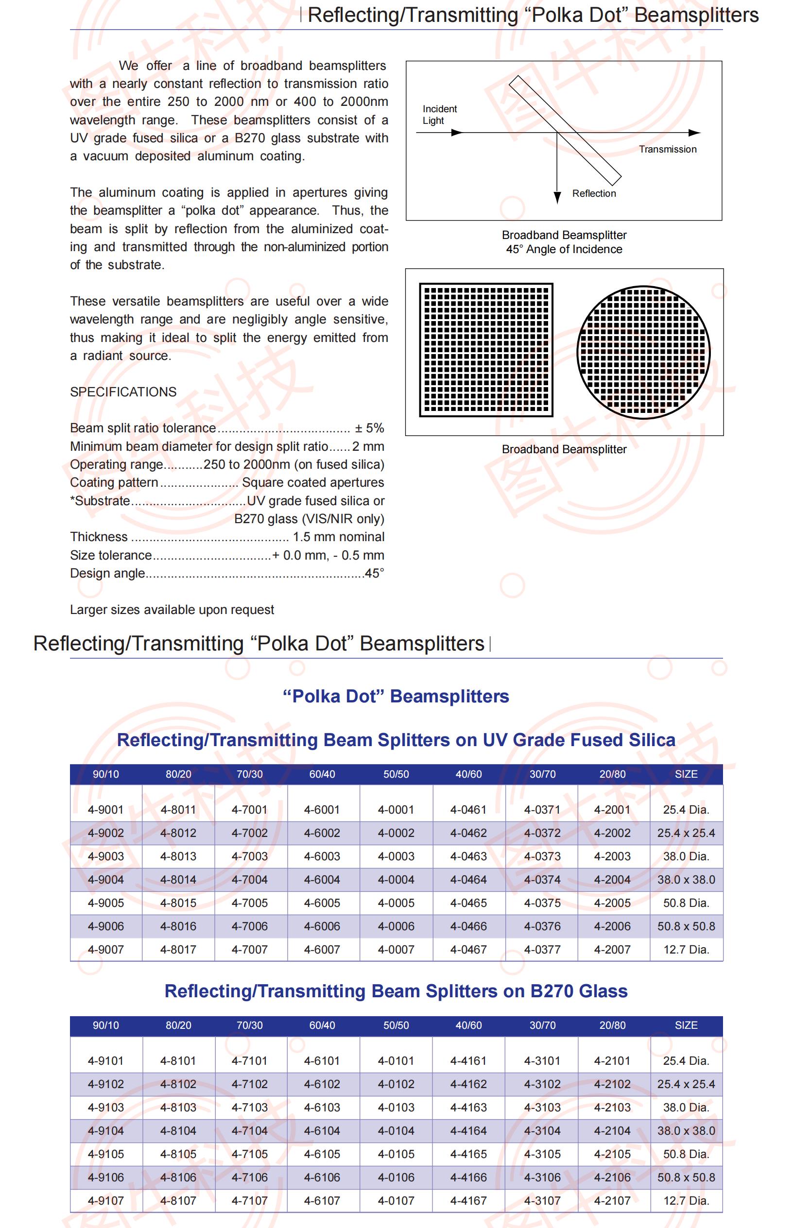 我们提供一种几乎恒定的反射透射比的宽带分束器,在整个250~2000nm或400~2000nm波长范围内。这些分束器由UV级熔融二氧化硅或B270玻璃基板与真空沉积铝涂层组成。铝涂层应用在光圈上,使分光器具有“圆点”外观。因此,光束通过从镀铝涂层反射而分离,并通过基板的非镀铝部分传输。这些万能的分束器在很宽的波长范围内都很有用,而且对角度的灵敏度可以忽略不计,因此,它是非常适合从辐射源分裂能量。