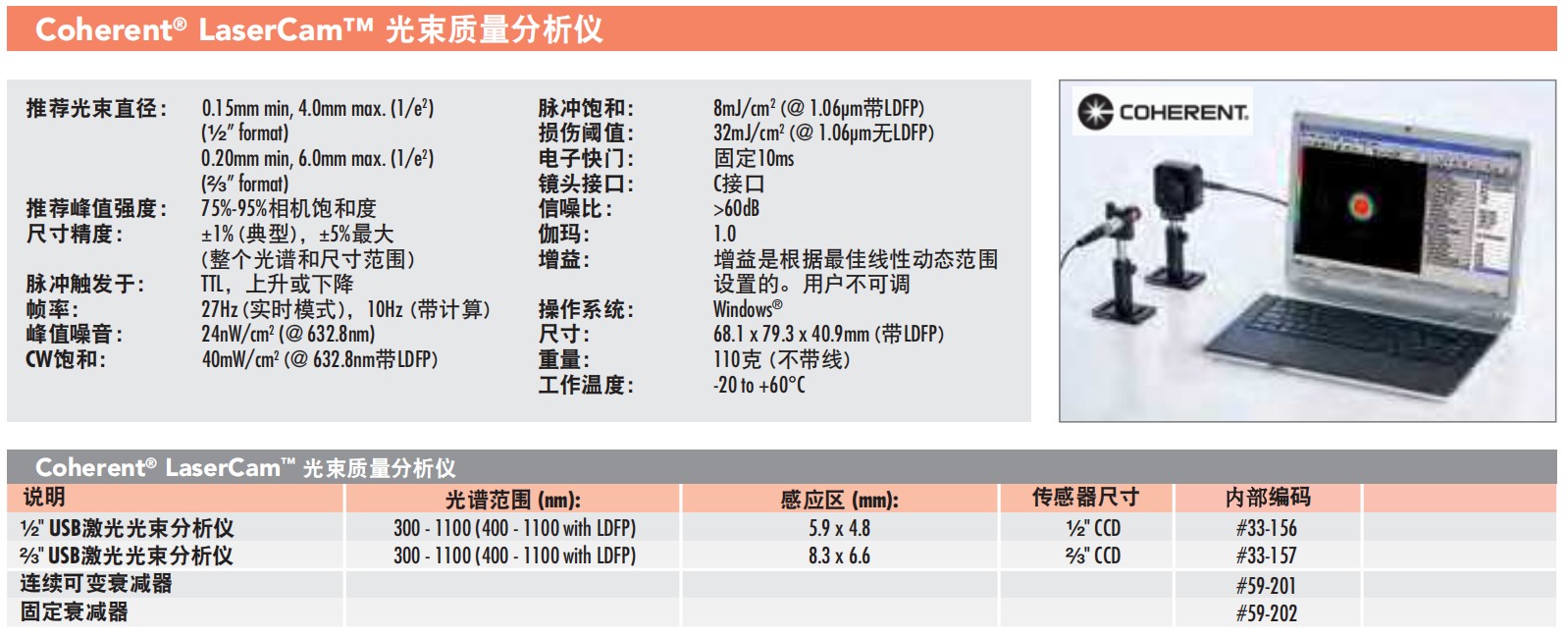 Coherent® Lasercam™本款光束分析仪信噪比高 ,线性响应度好。新的BeamView™4.4界面软件可TCP/IP以及NI LabVIEW&trade控制。通过库套件可方便地应用于各种场合。分析功能带有例子,可演示采集到的光束图像包括:光束中心位置,光束峰值强度位置,光束发散度,椭圆度,光束强度均匀性,高斯拟合,基于用户选择的峰值/总能量百分比而形成不同的光束直径/宽度等。