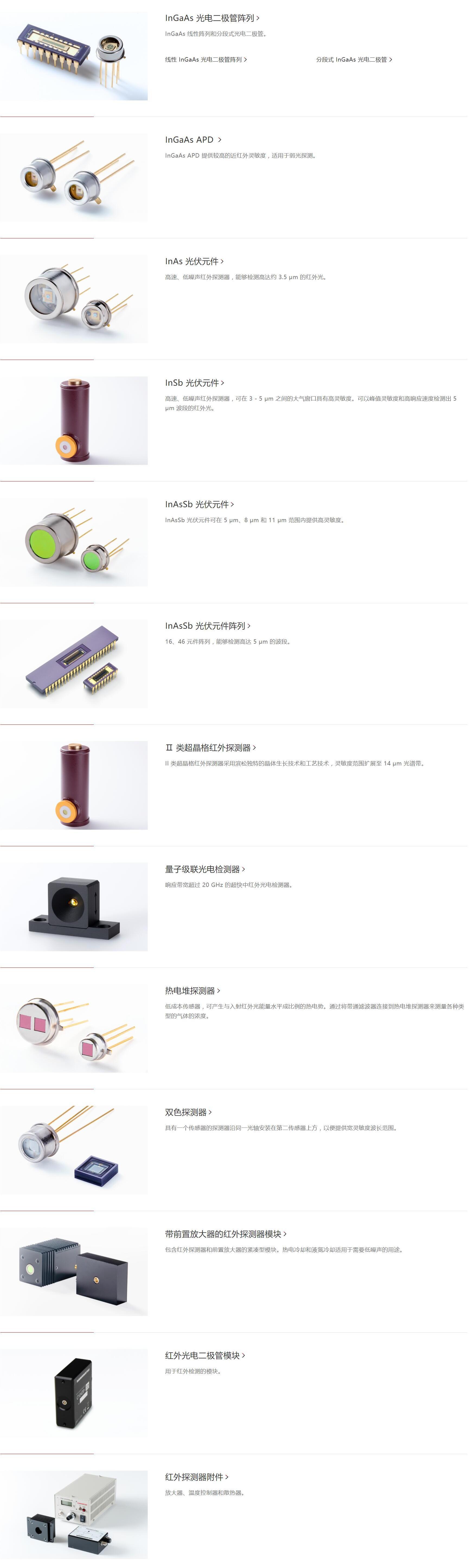 型号众多,联系我们进行选型,获取详细彩页。包含如下器件:InGaAs光电二极管、InGaAs光电二极管阵列、InGaAs APD、InAs光伏探测器、InSb光伏探测器、InSb光伏元件、InAsSb光伏元件、InAsSb光伏元件阵列、Ⅱ类超晶格红外探测器、量子级联光电检测器、热电堆探测器、双色探测器、带前置放大器的红外探测器模块、红外光电二极管模块、红外探测器附件。